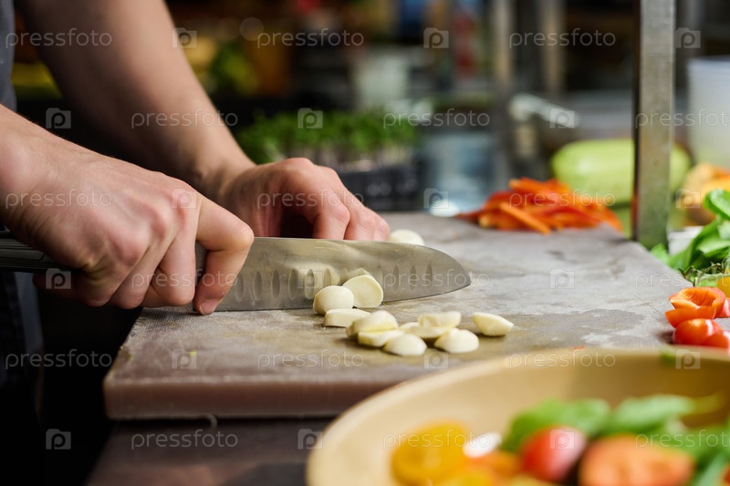 Руки молодого повара-мужчины режут кусочки свежего сыра мозарелла