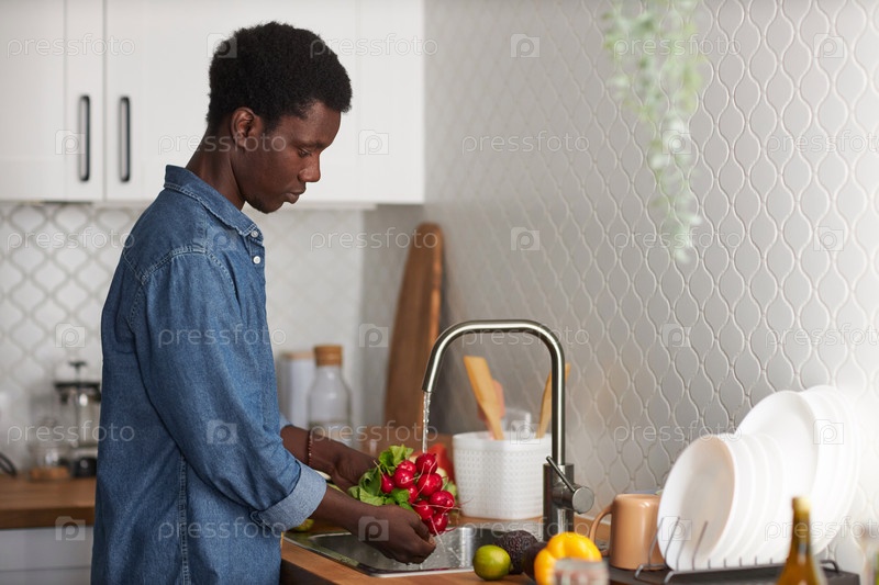 Черный молодой человек моет свежие овощи на кухне