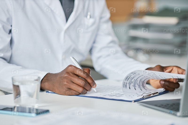 Близкий чернокожий врач заполняет бумаги за столом в офисе работает в клинике