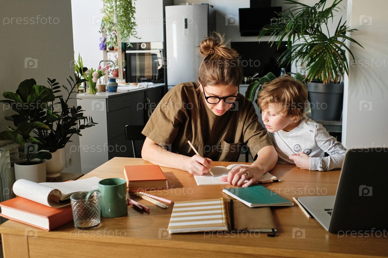 Мать делает домашнее задание с сыном