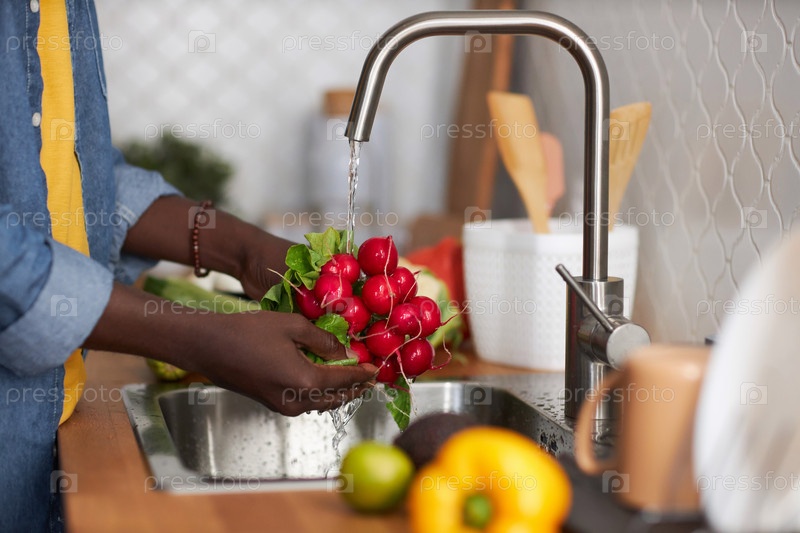Мужчина моет свежие овощи в водопроводной воде