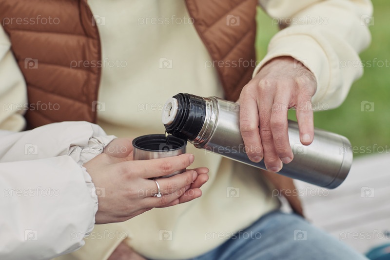 Молодая пара пьет горячий чай из бутылки