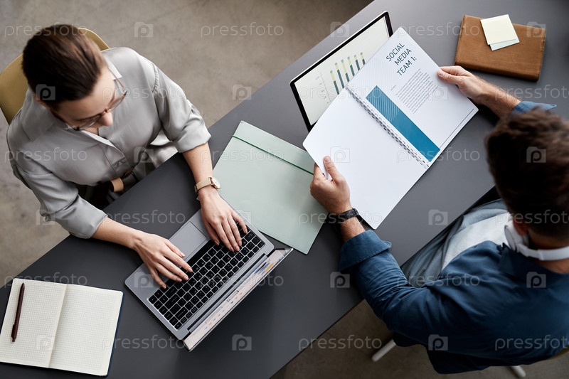 Выше снимок двух молодых экономистов, сидящих на рабочем месте перед ноутбуками