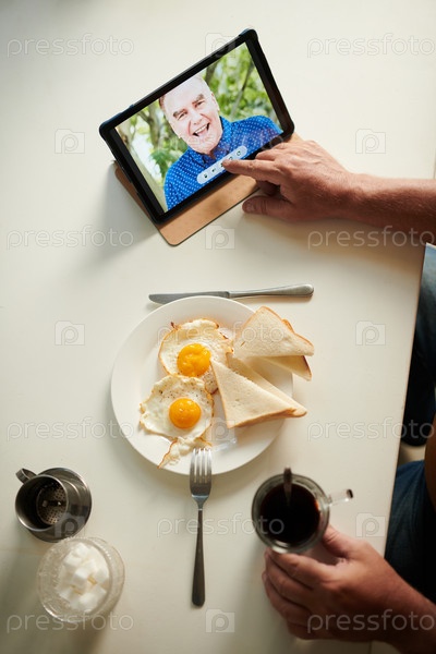 Старший мужчина ест вкусный завтрак