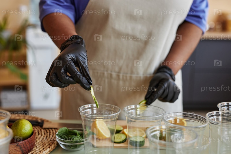 Близкий снимок молодой женщины, добавляющей лимонные ломтики в напитки с лимонадом на кухне