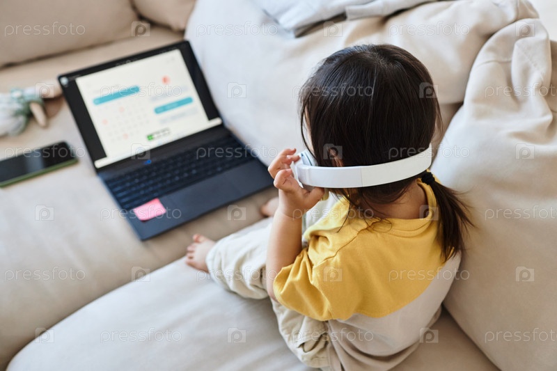 Маленькая девочка смотрит мультфильм на ноутбуке