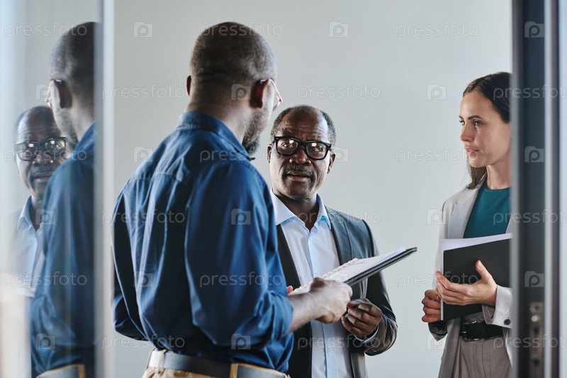 Уверенный взрослый босс смотрит на одного из подчиненных во время обсуждения
