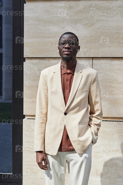 Молодой серьезный бизнесмен в белом формальном костюме слушает музыку на наушниках