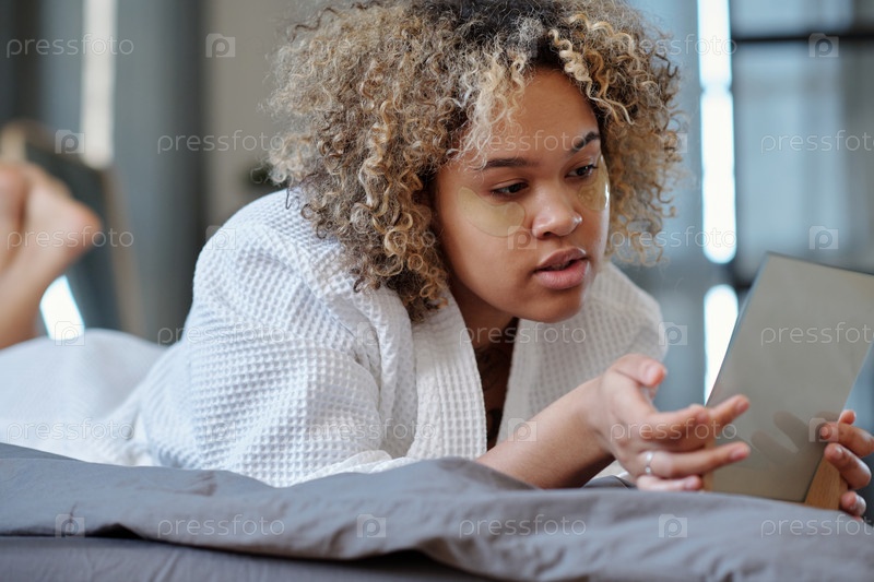 Молодая женщина держит зеркало перед лицом, отдыхая в постели