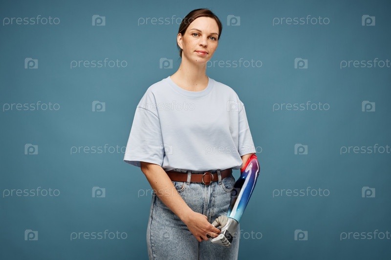 Не улыбающаяся женщина с протезированной рукой