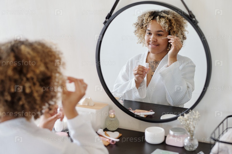 Счастливая афроамериканская девушка наносит каплю сыворотки или масла под область глаз