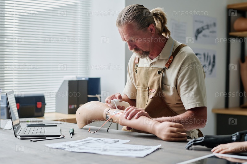 Бородатый старший ремесленник строит протезы рук с ноутбуком