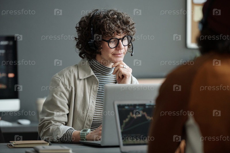 Молодая уверенная в себе менеджерка по ИТ-поддержке, слушающая онлайн-клиента