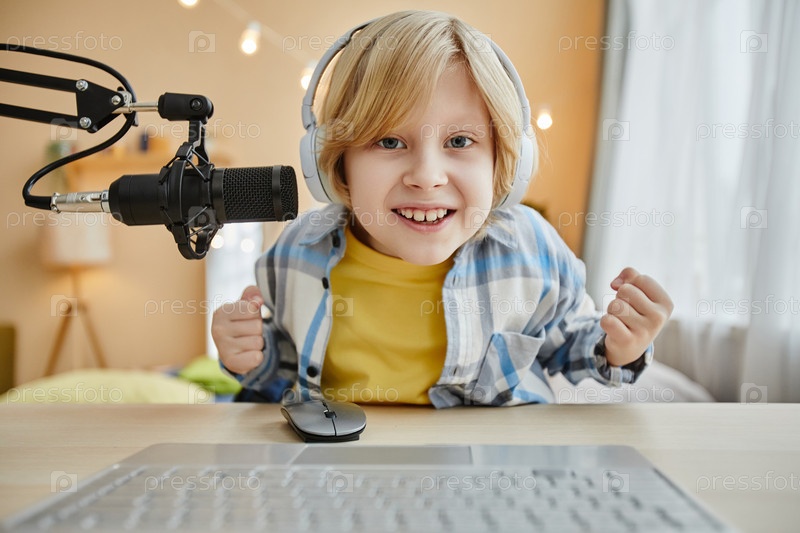 Милый улыбающийся блондин в наушниках выражает удовлетворение