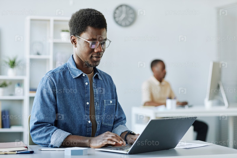 Чернокожий мужчина, использующий ноутбук на работе Минимальный