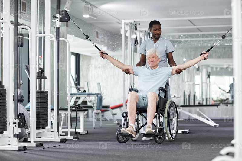 Пожилой человек в инвалидном кресле делает реабилитационные упражнения