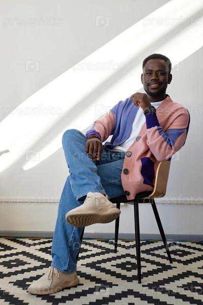 Творческий чернокожий мужчина, сидящий в кресле к стене и улыбающийся с уверенностью