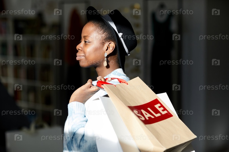 Улыбающаяся чернокожая женщина, держащая сумки для покупок в магазине подержанных товаров