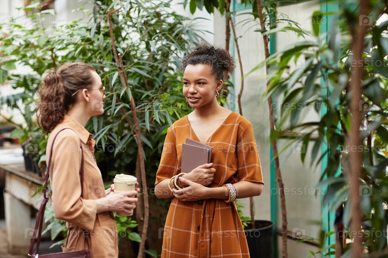Молодая элегантная цветочная в платье консультирует клиента со стаканом кофе
