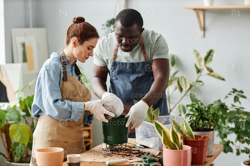 Два человека пересаживают растения вместе, готовясь к весеннему сезону