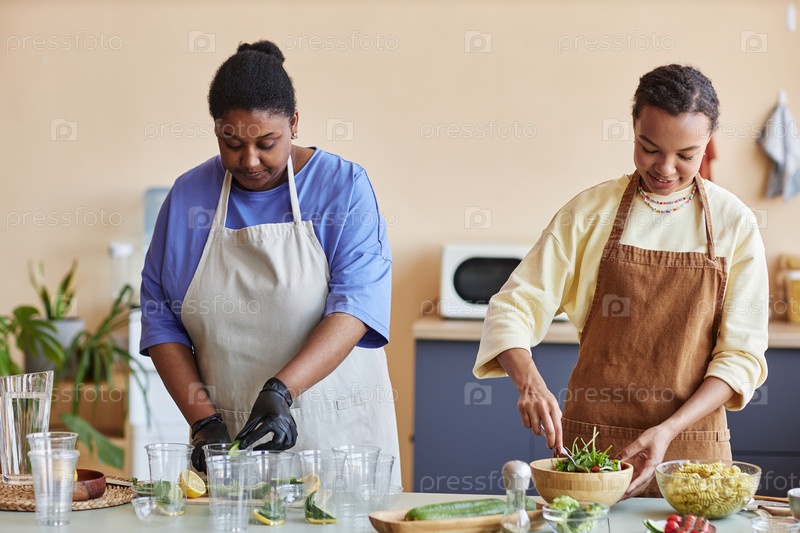 Две афроамериканские женщины готовят вместе на кухне и делают приготовление пищи