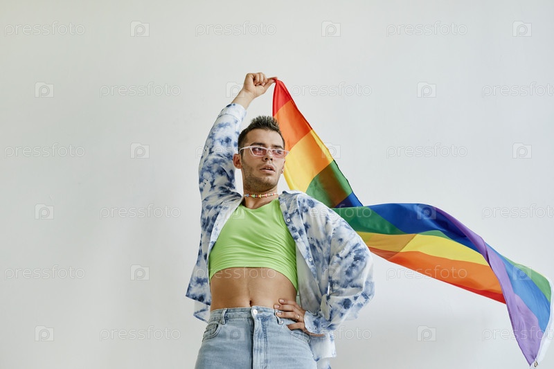 Уверенный в себе гей-мужчина размахивает флагом гордости