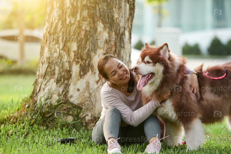 Женщина обнимает пушистую собаку