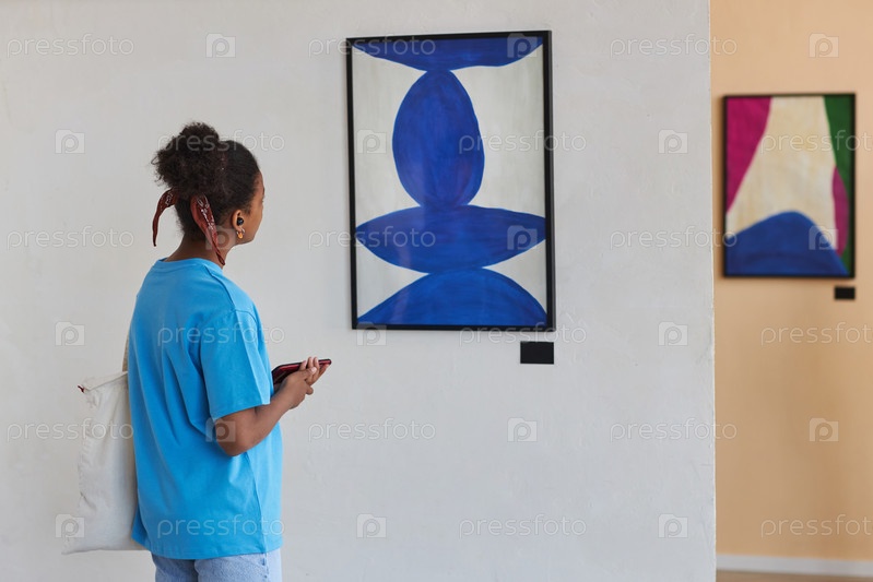 Задний вид черной девочки-подростка, глядящей на абстрактное искусство в художественной галерее