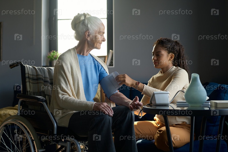 Мультиэтническая девочка-подросток измеряет кровяное давление своей бабушки
