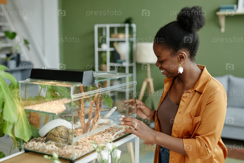 Счастливая молодая черная женщина смотрит на белую крысу-змею, ползущую внутри террариума