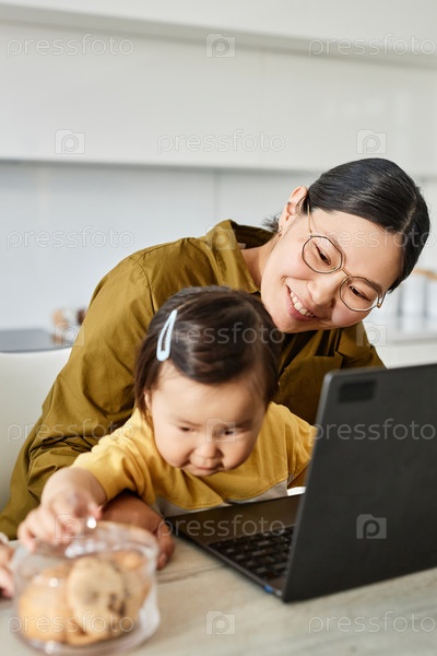 Женщина работает на ноутбуке, сидя со своим ребенком