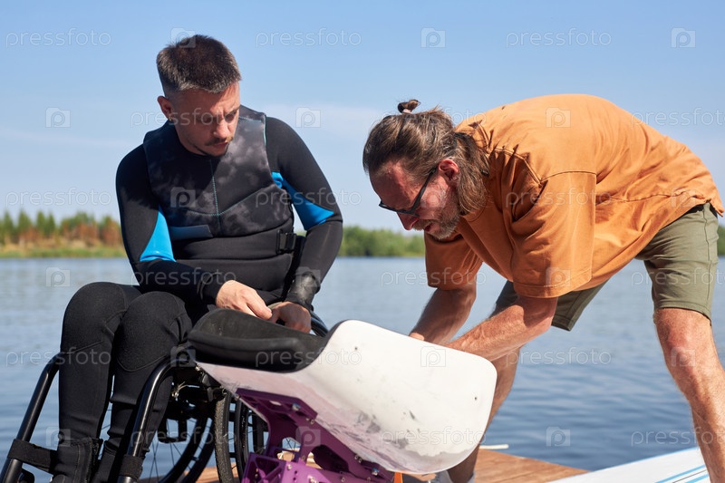 Спортивный инструктор помогает мужчине с инвалидностью собирать адаптивное оборудование