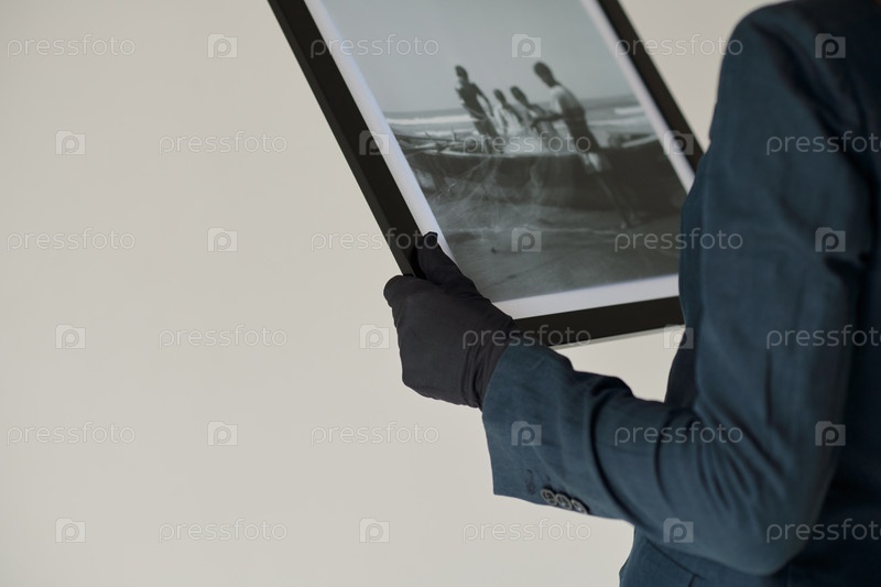 Близкий план реставратора в черных перчатках и куртке, держащего картинку в кадре