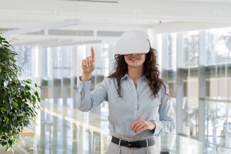 Счастливый молодой разработчик современных игр, указывающий на виртуальный экран