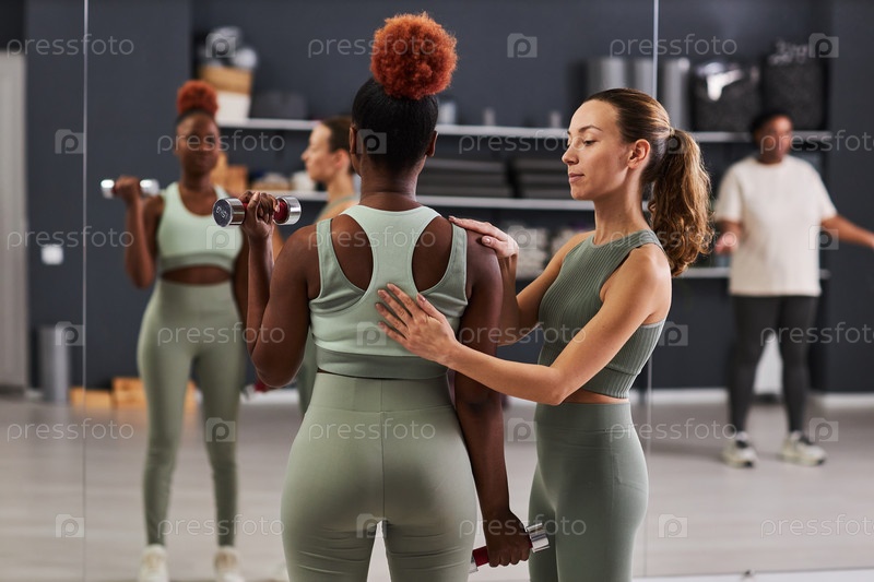 Инструктор тренирует девушку в тренажерном зале