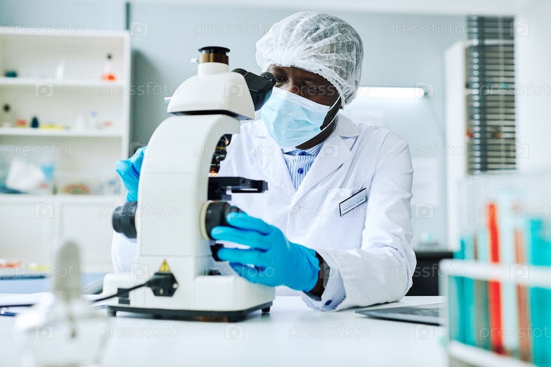 Африканский американец, использующий микроскоп для проведения исследований в лаборатории