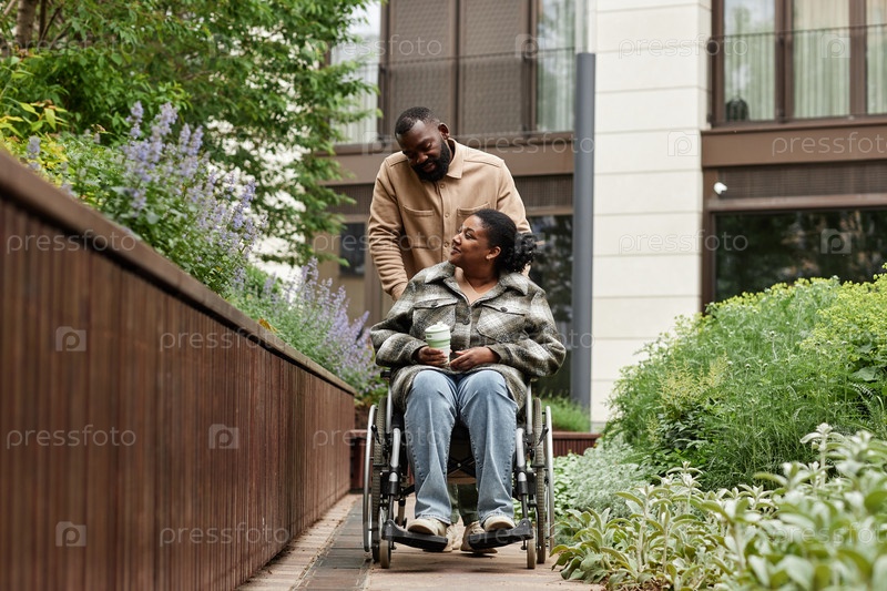 Улыбающийся мужчина помогает партнеру в инвалидной коляске на открытом воздухе