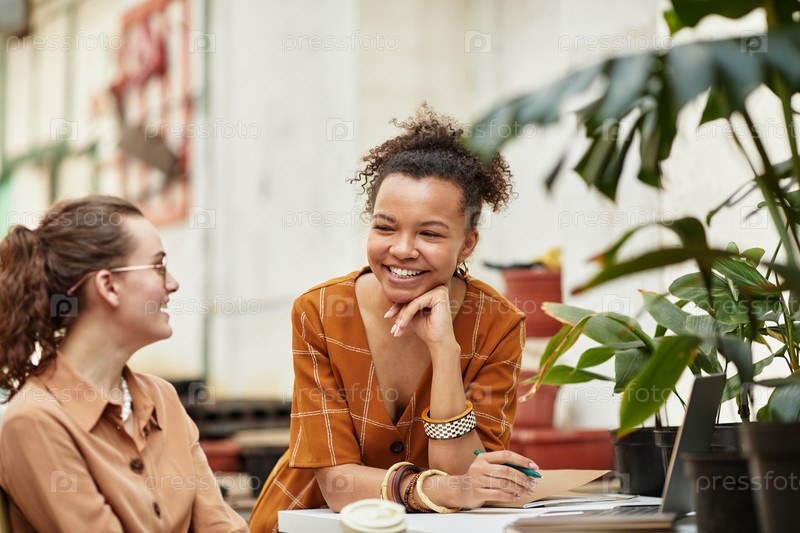 Молодая улыбающаяся двойнородная садовница и ее коллега обсуждают