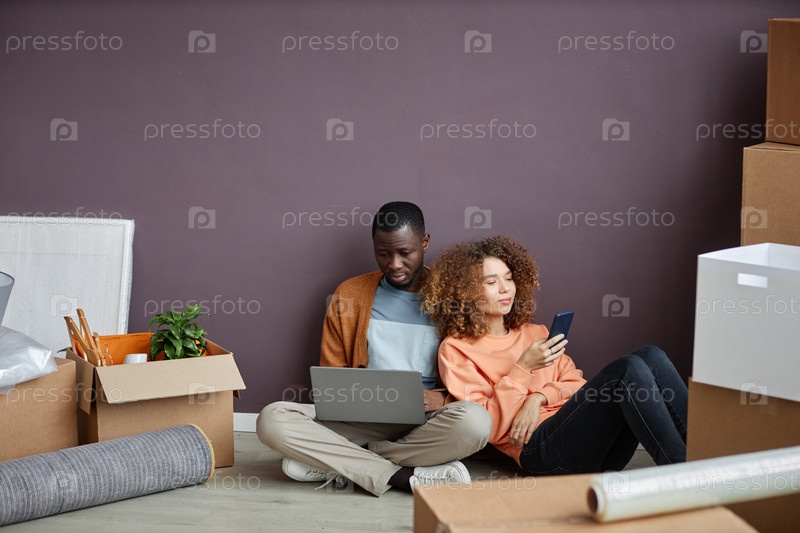 Пара, использующая гаджеты в новой квартире