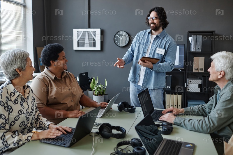 Бородатый молодой человек ведет компьютерный класс для старшеклассников, используя ноутбуки за столом
