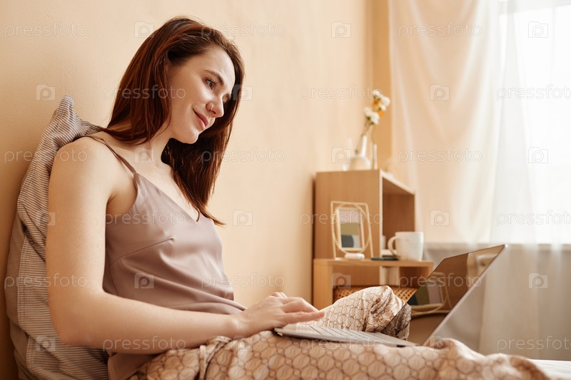 Молодая женщина использует ноутбук в постели дома и улыбается