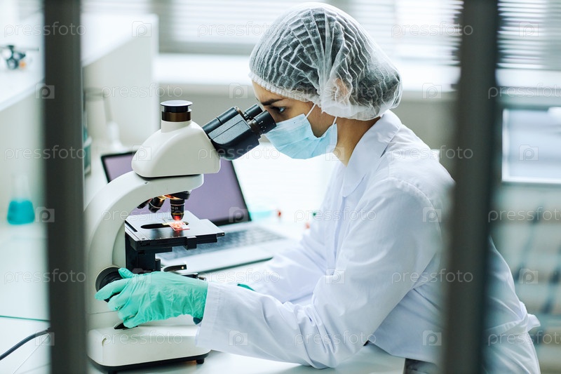 Молодая женщина-техник, которая смотрит под микроскопом и работает в лаборатории