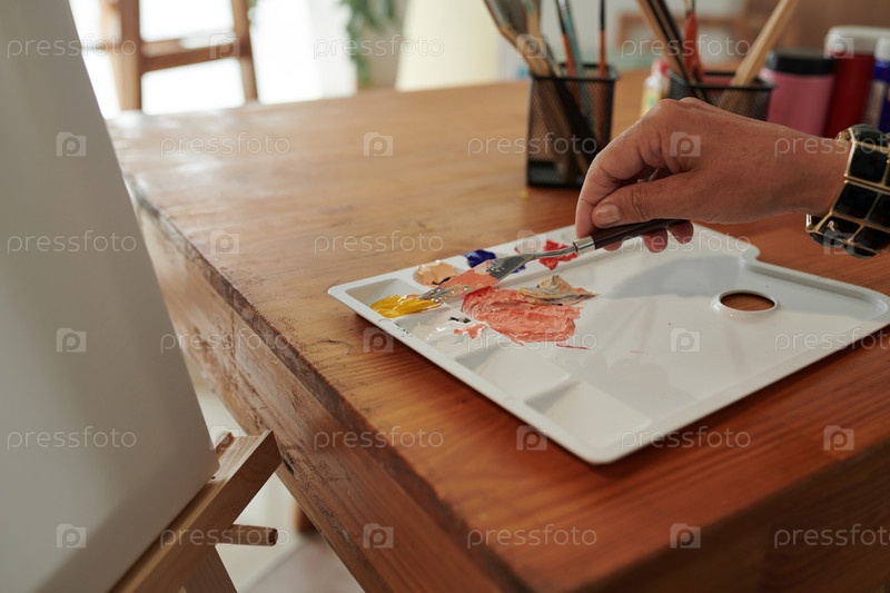 Рука креативной женщины, смешивающей краски с ножом на палитре