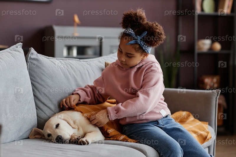 Маленькая черная девочка, заботящаяся о милой собаке спит на диване дома