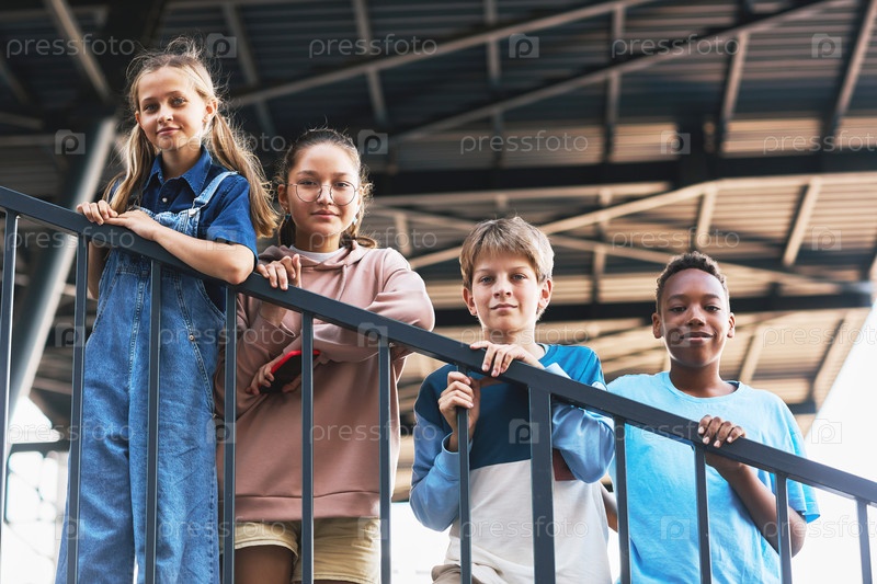 Группа милых мультикультурных друзей в повседневной одежде, стоящих у ограждения