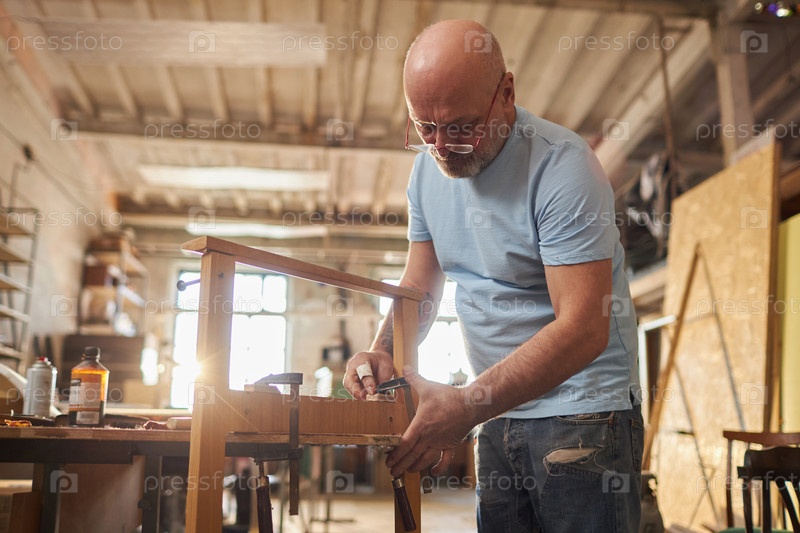 Низкий угол старший ремесленник создает деревянную мебель в столярной мастерской