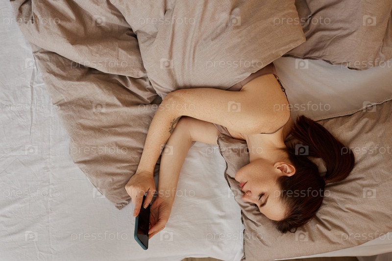 Вид сверху молодая женщина, лежащая в удобной кровати и использующая смартфон