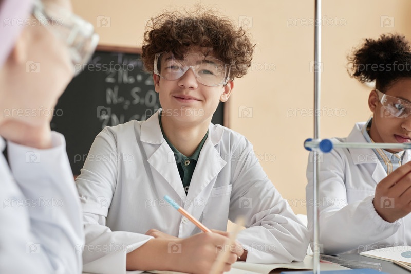 Улыбающийся школьник с кудрявыми волосами наслаждается уроком естественных наук, глядя в камеру