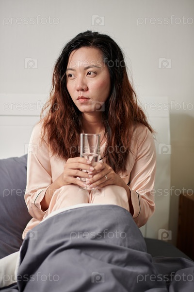 Женщина, пьющая воду в постели
