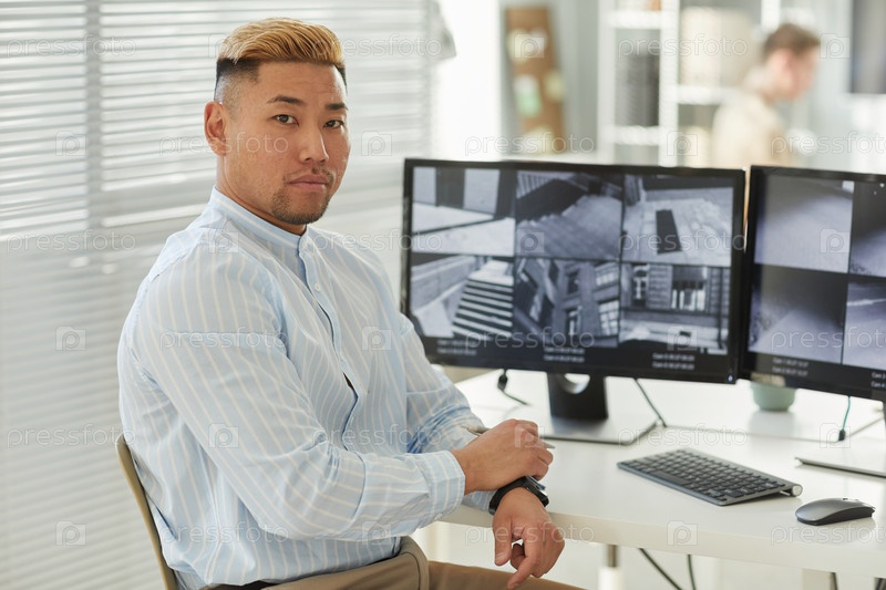 Молодой азиат смотрит на камеру с видеонаблюдением